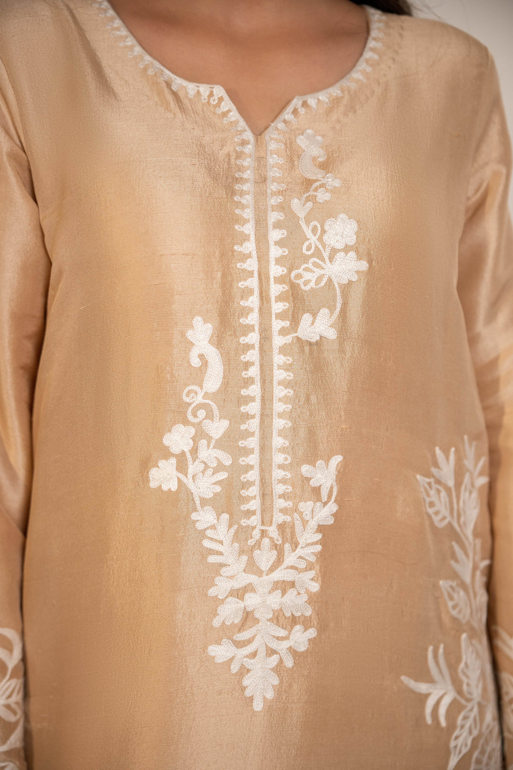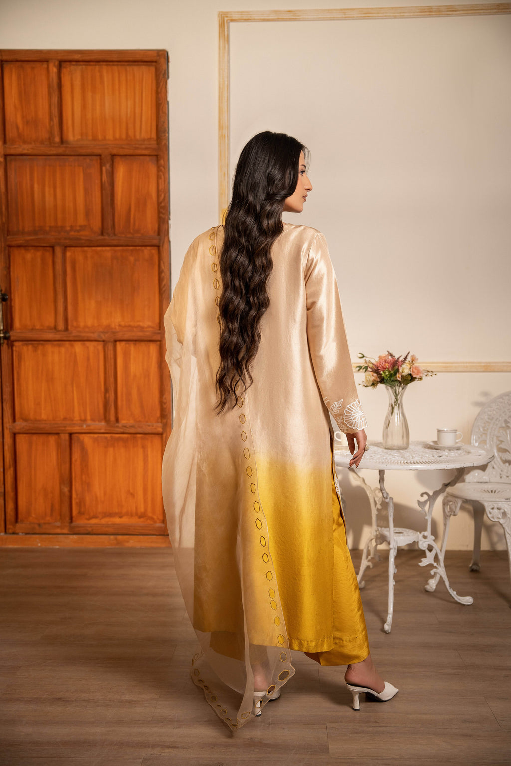 Product Specifications:Outfit Type: Three-Piece Stitched SuitFabric (Shirt): Ultra Premium 100% Sheesha SilkFabric (Trouser): Matching Plain Sheesha SilkFabric (Dupatta): Organza Color Palette: Soft Beige to Golden Yellow Gradient. (Tye & Dye)Embroidery Type: Fine Aaree WorkFloral motifs on shirt front and sleevesDesign Elements:Ombre dye effectClassic feminine silhouetteLight, breathable, and rich in textureOccasion: Spring Festivities | Eid | Daytime GatheringsCare: Dry Clean Only | Iron on Low | Avoid Direct Sun Exposure