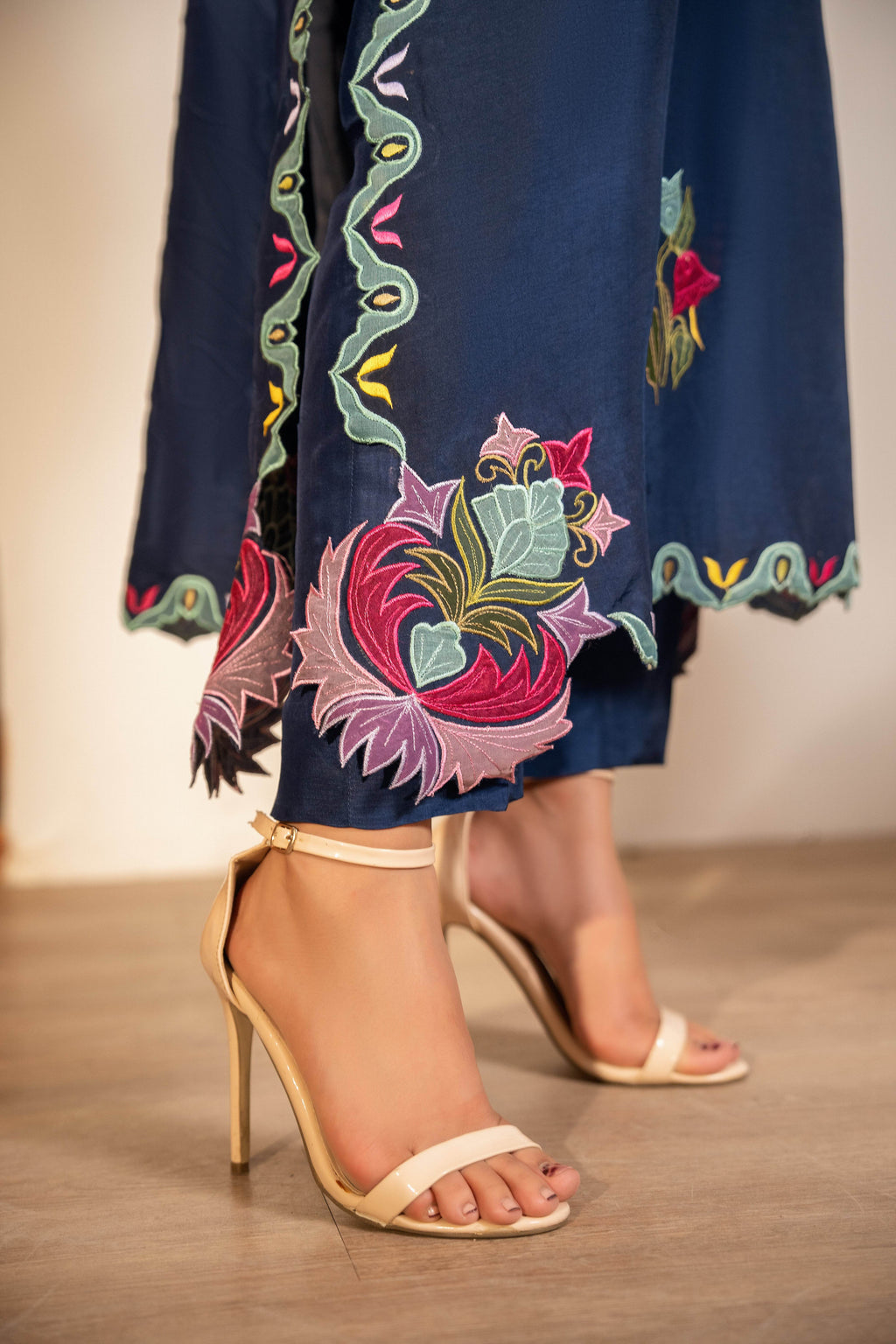A celebration of spring, the Daisy Blossom Kaftaan Set is an exquisite expression of artistry and comfort. Crafted from our premium Sheesha Silk, this two-piece ensemble features Pakistan’s finest multi-colored embroidery, beautifully set against soft navy and ivory tones. The flowy kaftaan-style shirt paired with refined trousers creates a silhouette that is as effortless as it is elegant — perfect for leisurely brunches, spring soirées, or everyday understated luxury