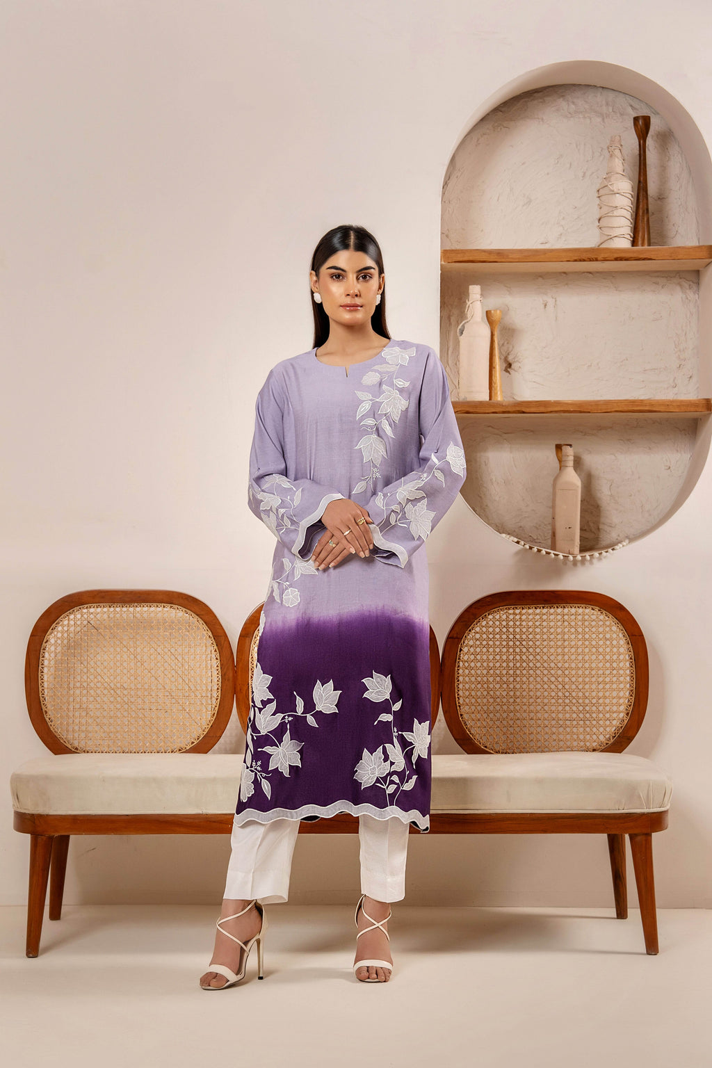 Step into elegance with this Pure Cotton Net Tie & Dye 2-Piece, a graceful blend of tradition and modern artistry. The soft cotton net fabric offers a breathable, airy feel, making it perfect for all-day wear. Intricately embroidered patchwork detailing elevates the design, adding a touch of sophistication to the dreamy lavender-to-purple gradient. The delicate floral motifs, scalloped edges, and wide sleeves complete the look, making it a timeless ensemble for festive gatherings or refined daywear.