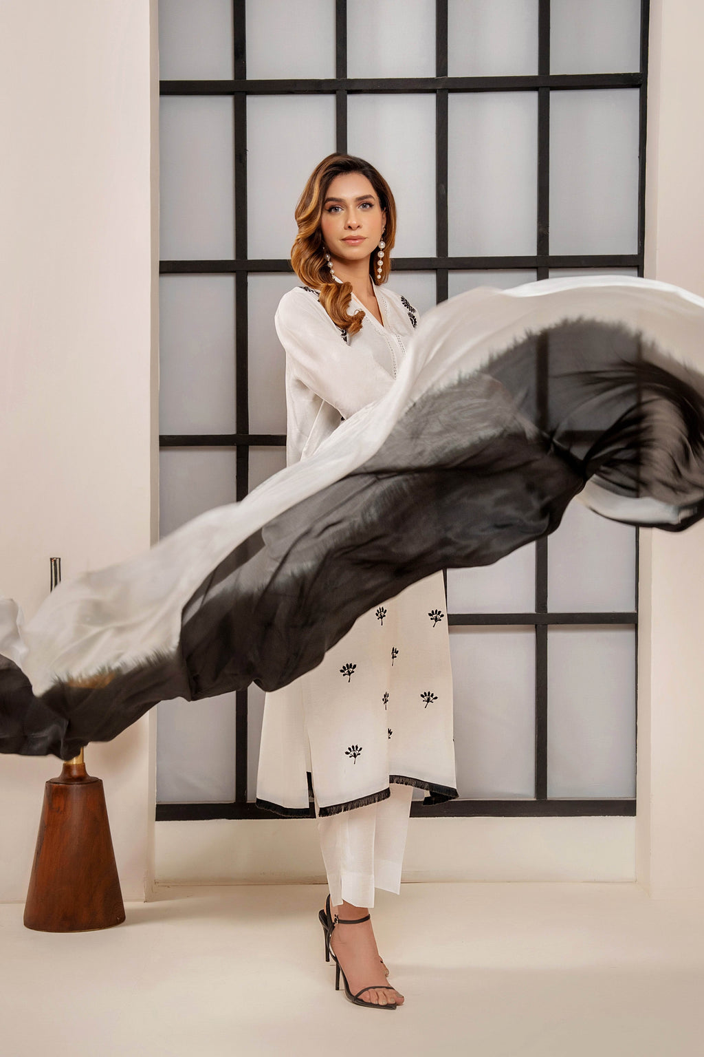 The monochrome tie & dye dupatta in black and white adds a contemporary twist, effortlessly balancing tradition with modern sophistication. With its delicate detailing, flowing silhouette, and refined craftsmanship, this outfit is designed for the woman who embodies grace and power.