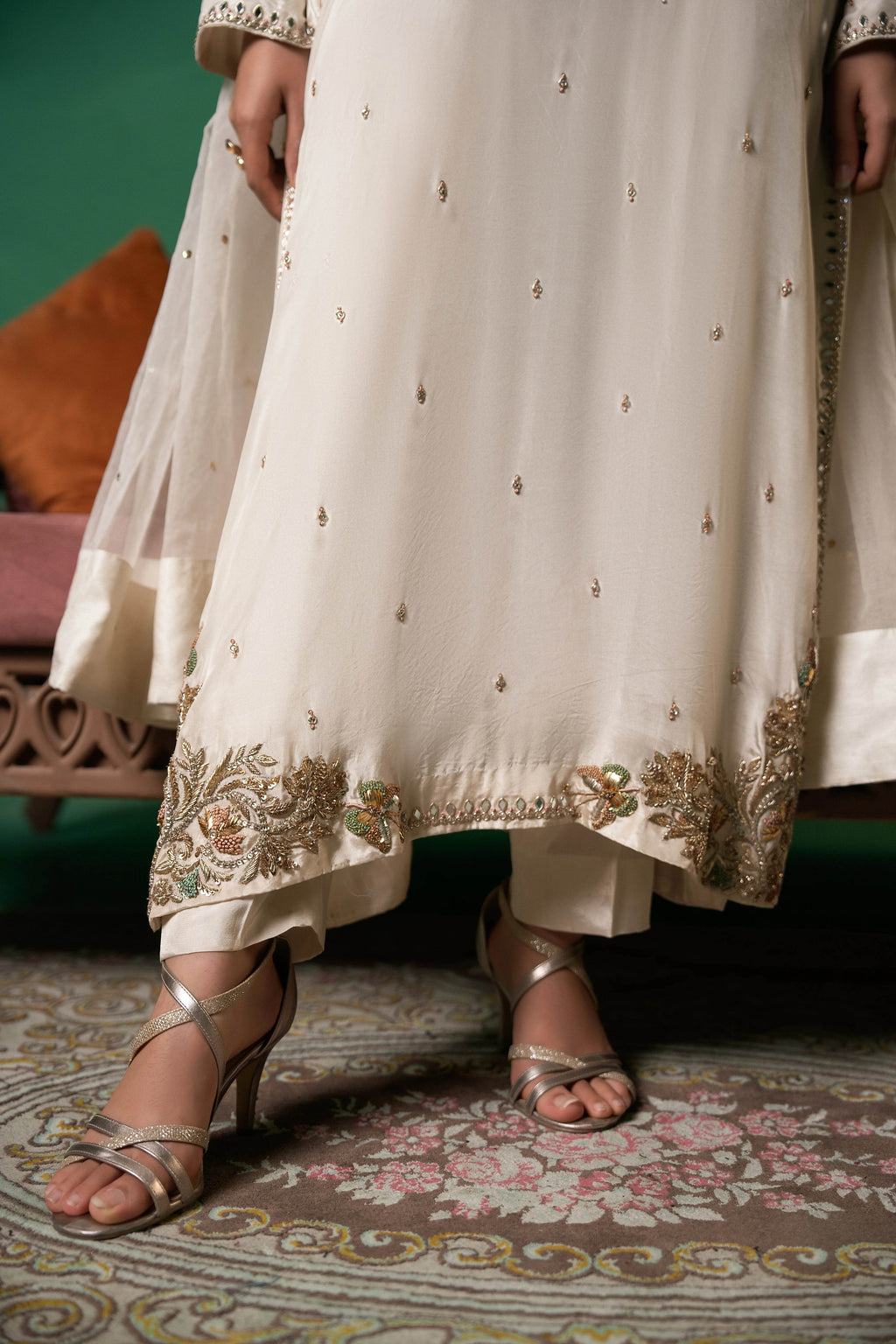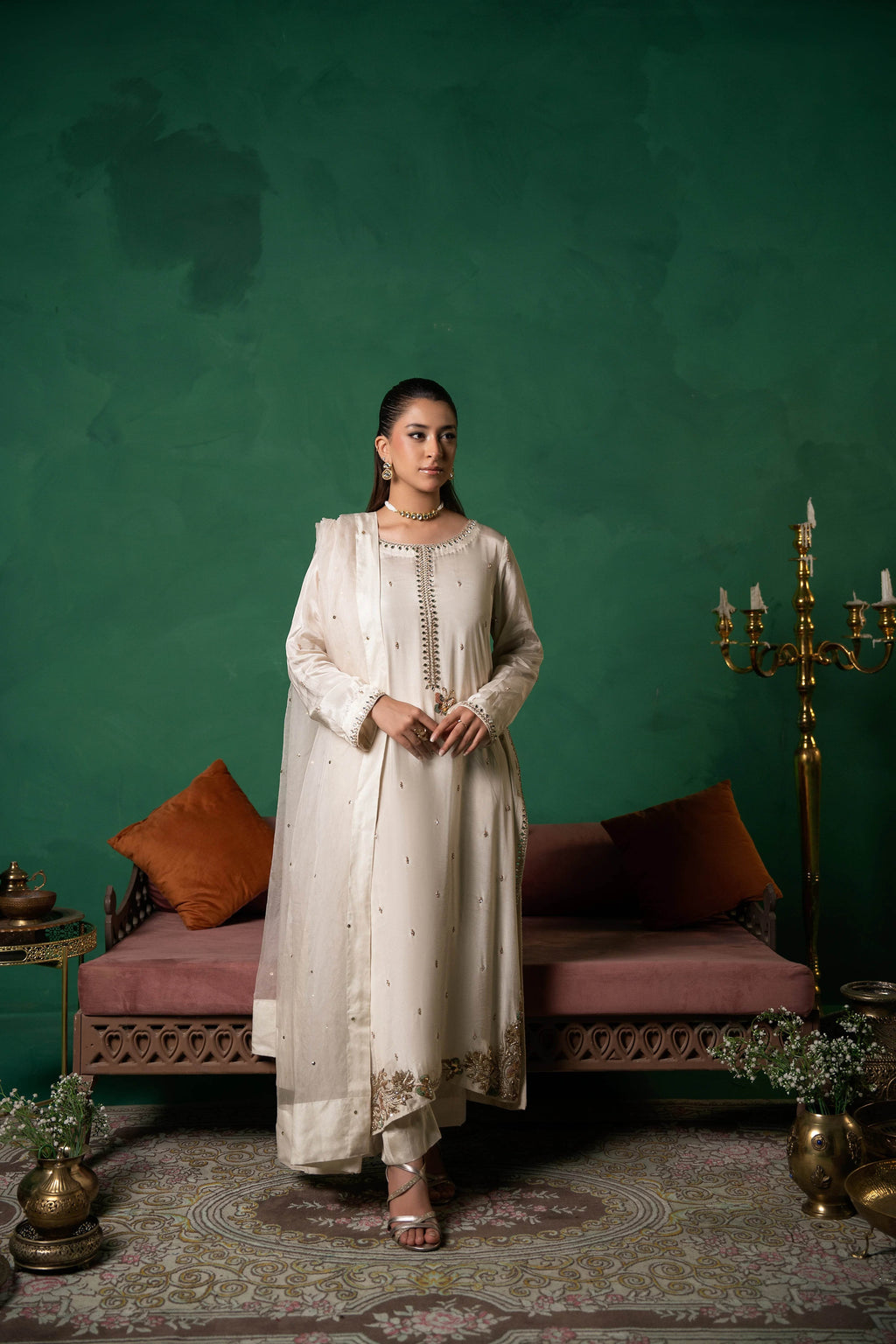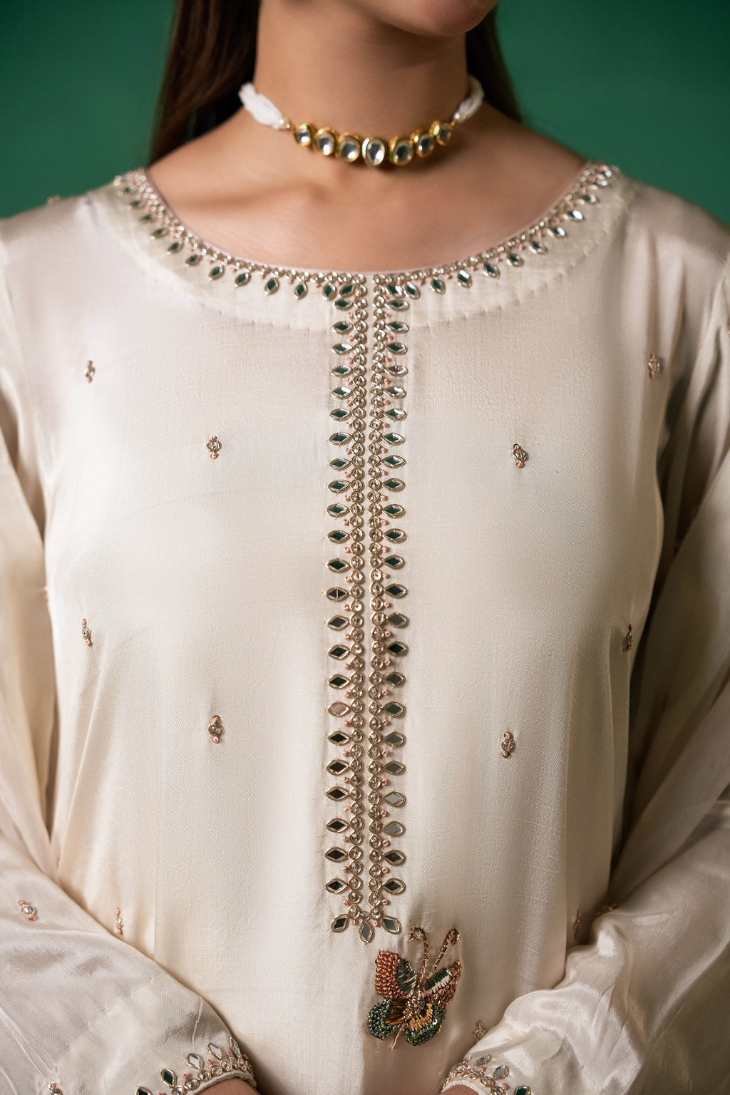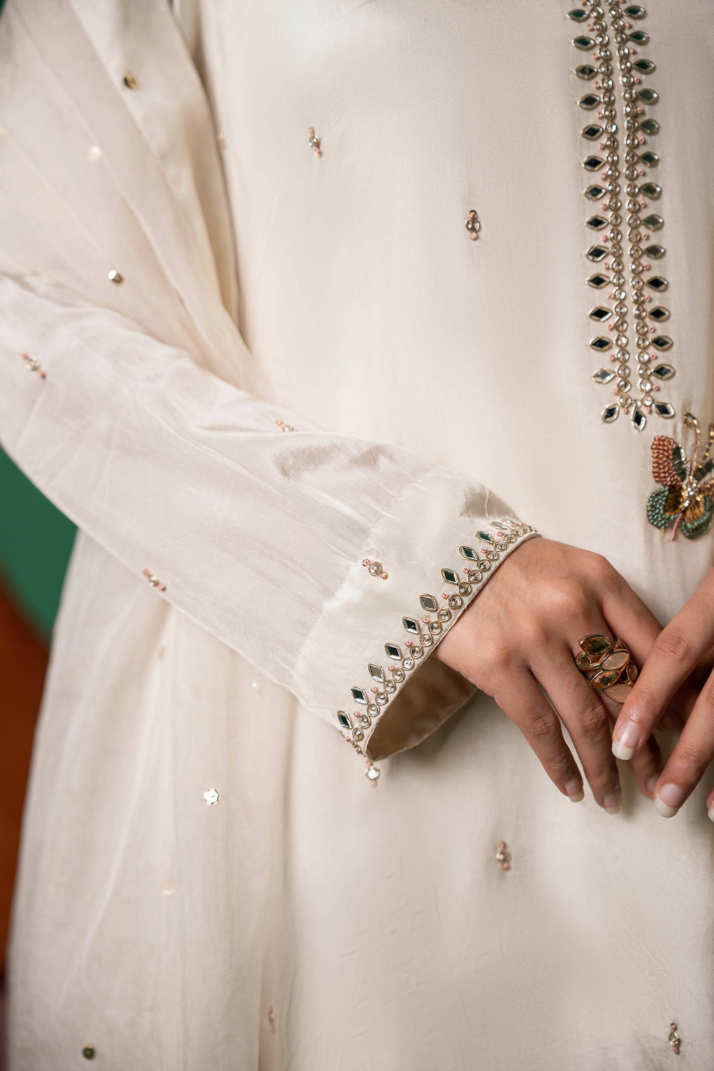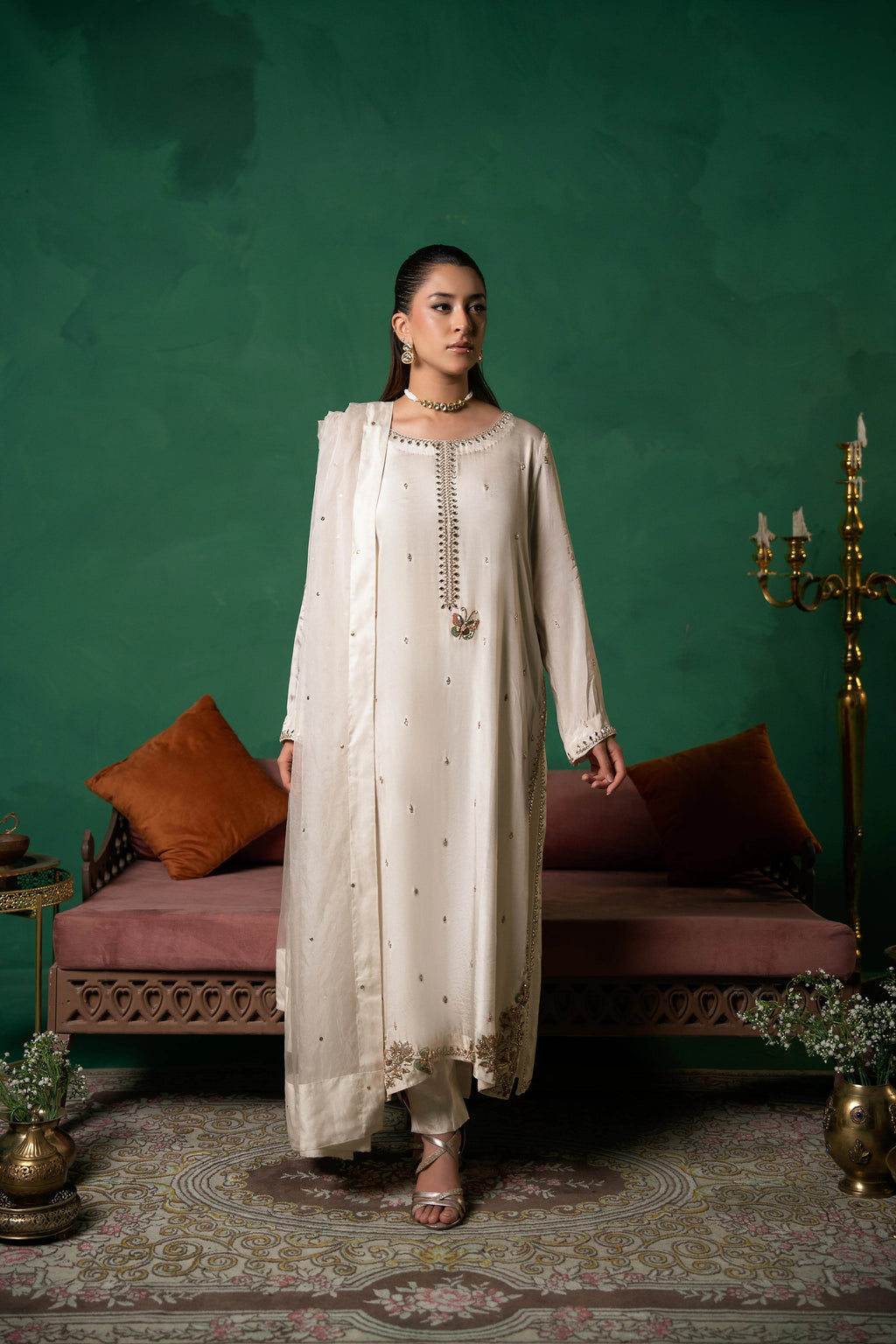 Introducing Nooréa , a modern-day emblem of grace and minimal elegance from our signature Tehzeeb Collection. This three-piece masterpiece is designed for the woman who radiates quiet confidence — a symphony of silk, craftsmanship, and understated luxury.Tailored from premium Korean silk, the shirt features minimal yet meticulous handmade adda work, flowing gently along the neckline and center placket. A show-stealing handcrafted butterfly motif, delicately perched near the neckline, adds an artistic statement — making this outfit truly one of a kind.The hemline of the shirt is accentuated with hand-done dorri detailing and embellishments, adding subtle richness without overpowering the look. The ensemble is paired with a tonal trouser and a floaty pure organza dupatta, finished with soft silk edging and a gentle shower of handcrafted accents, ensuring a look that is effortlessly polished and elevated.