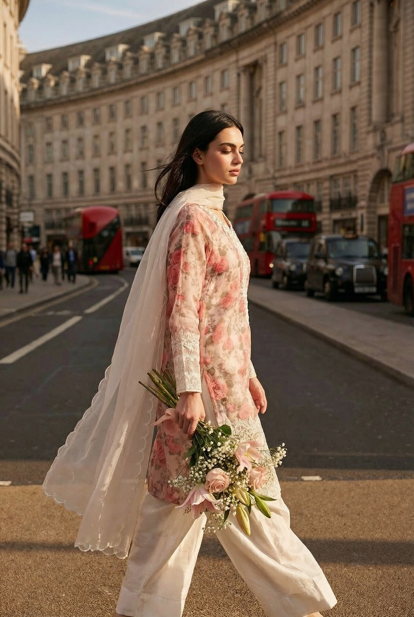The flowing Korean silk farshi shalwar adds luxury movement while the pure organza dupatta completes the look with a soft, weightless drape.